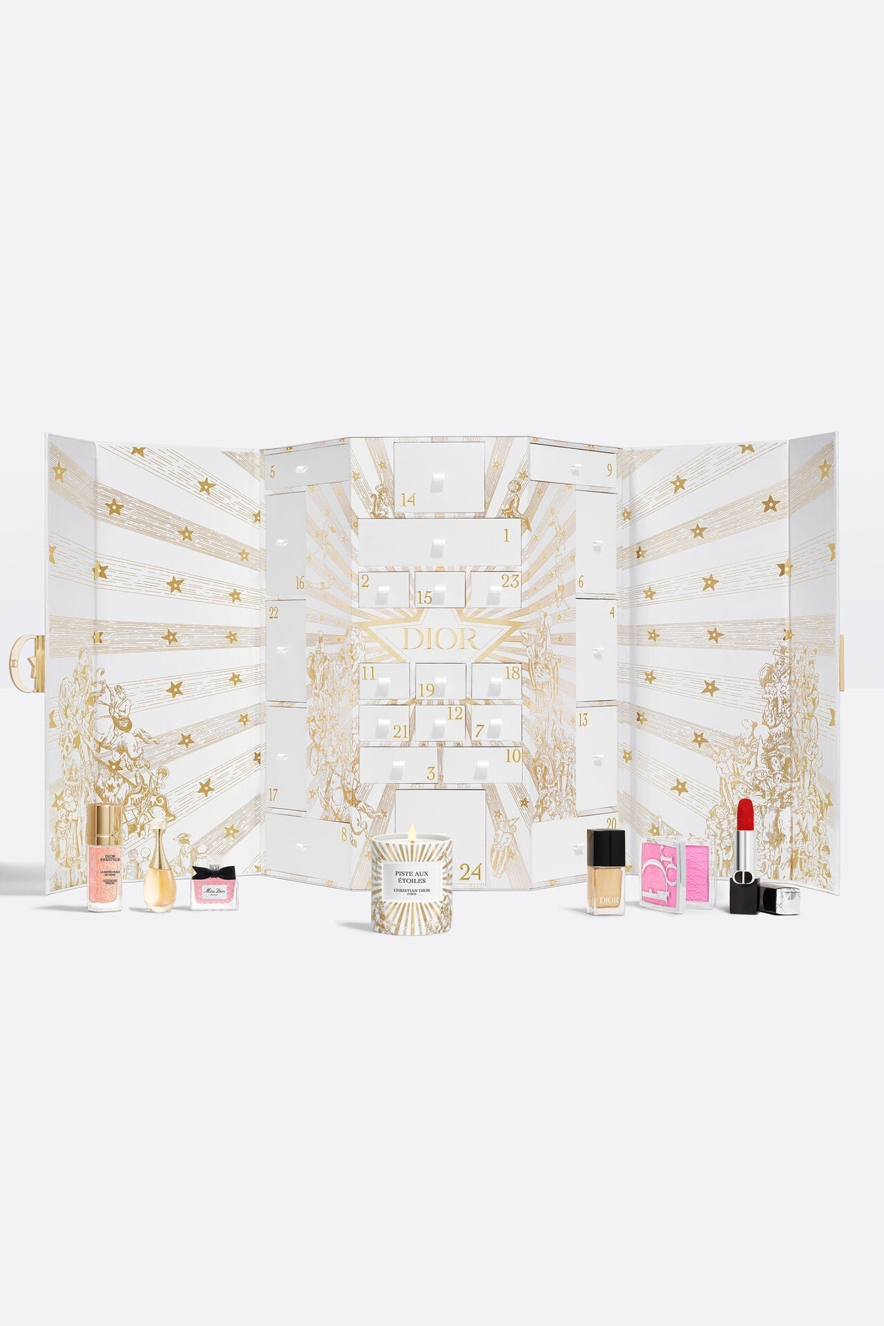 Un’immagine poetica di Parigi, questo Calendario dell’Avvento Dior racchiude 24 creazioni in miniatura della Maison: fragranze raffinate, prodotti di make-up e skincare sofisticati, e una candela profumata.