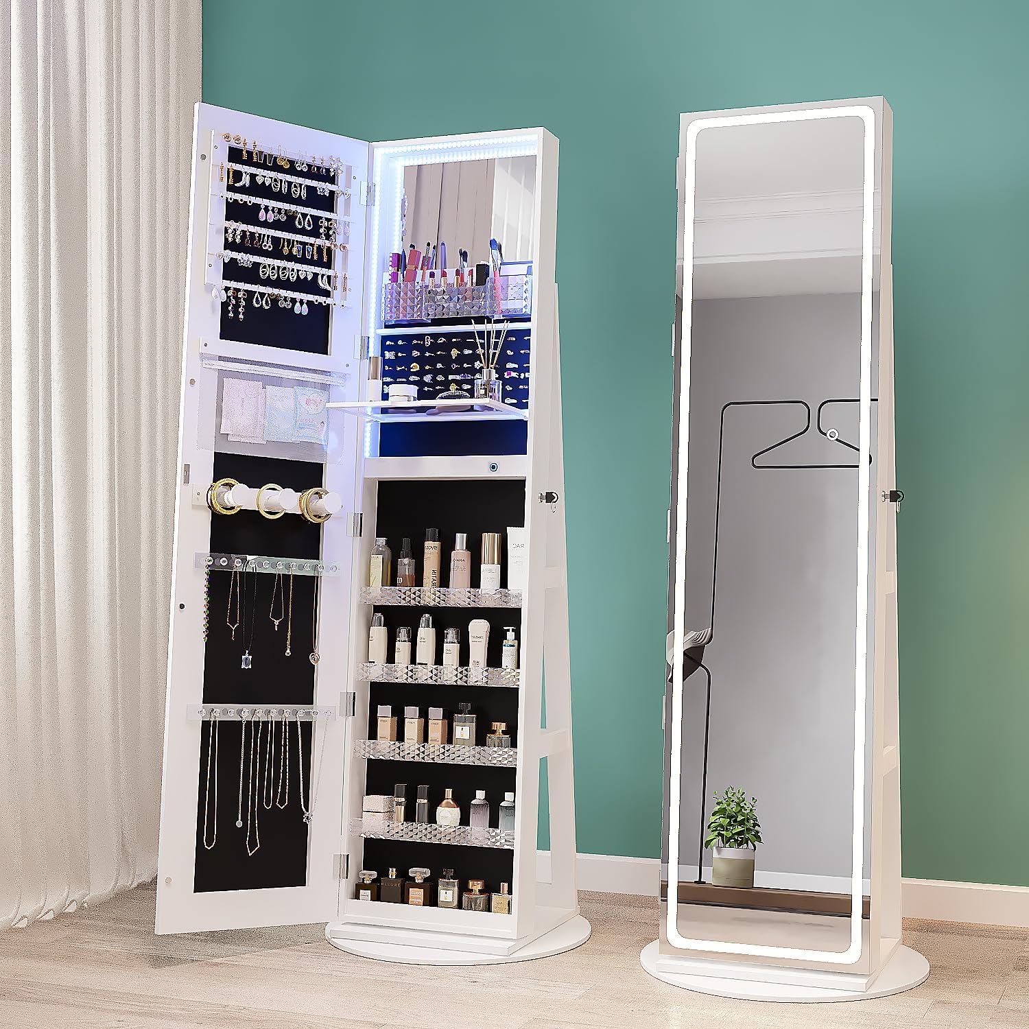 Design 4 in 1, Grande Capacità – Il nostro armadio portagioie con specchio combina un organizzatore per gioielli, uno specchio a figura intera, uno specchio LED per il trucco e una struttura di stoccaggio in un’unica unità spaziosa. Consente di scegliere e abbinare facilmente i gioielli mentre controlli il tuo look. Migliora la tua esperienza di preparazione.